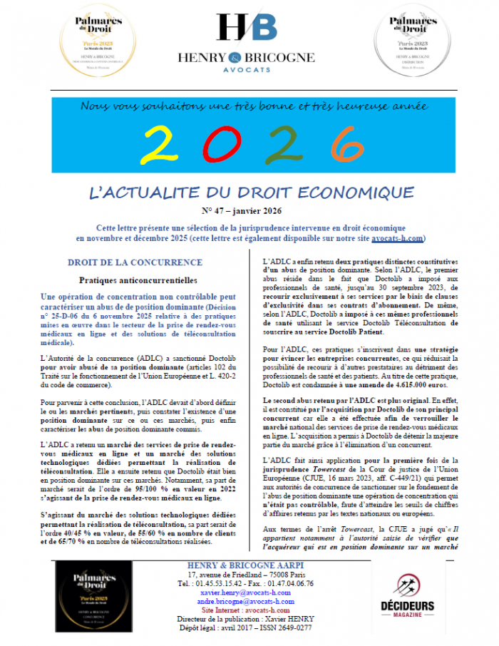 Le Cabinet Henry & Bricogne Cabinet est intervenu au cours des derniers mois auprès de l’Autorité de la concurrence dans deux opérations de concentration.