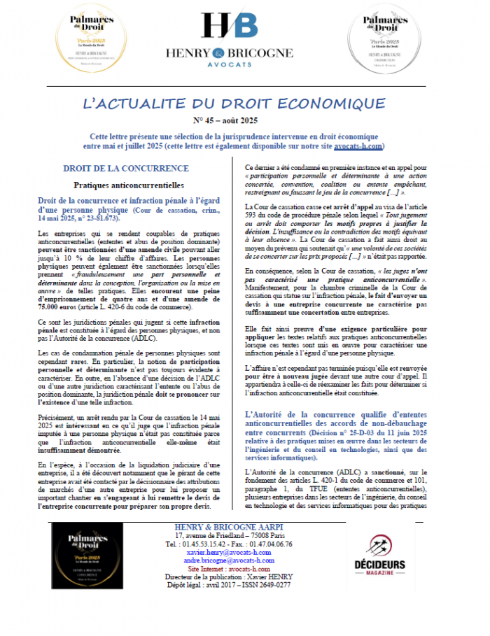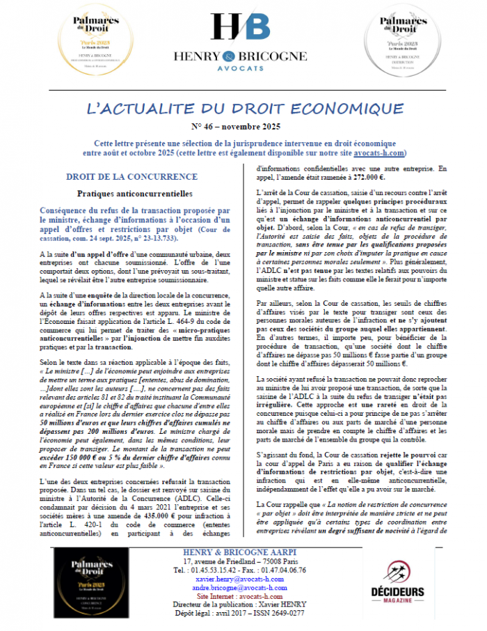Follow our news and in particular read and download the Firm Newsletters consisting of a selection on a regular basis of material and case law in economic law.